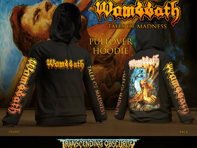 The Wombbath pullover hoodie is an absolute unit! It's made of extremely comfortable cotton, and has prints on both sleeves as well as a giant band logo on the front. Then, of course, there is the massive print of the phenomenal album artwork by Sv Bell (Amorphis, Kataklysm) on the back, and the kangaroo pocket in the front to tuck your hands and essentials in.These are very limited so don’t miss out!